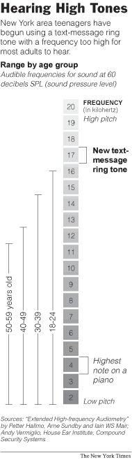 Teenagers use it in classes, to avoid detection by teachers. Shopkeepers use the same technology to drive away rowdy teenagers, by creating a loud sound that doesn’t affect adults. This works because adults gradually lose the ability to hear high-pitched sounds. (via NY Times) Comments Livy 12 Nov 2006 5:33 pm: I can here the sounds up to about 18KHz.
