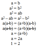 I’ve seen many proofs that 1=2. Here’s a classic. The (not-so-subtle) error in the above proof is that we’re cancelling (a-b) on both sides, when (a-b) equals zero. That is, we’re dividing by zero on both sides. That completely invalidates the equality. Another proof uses the fact that the square root of a number can be both positive or negative. ...