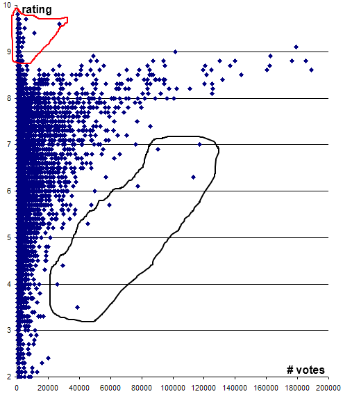 If you plot all movies by their number-of-votes on IMDb and their rating on IMDb, you get the chart below. Movies with more votes usually have a higher rating. I was interested two things: Which are the unpopular, but good (highly-rated), movies? Which are the popular, but lousy, movies? The answer to the first question is: there are no unpopular good movies. The cluster of dots on the top-left (in red) are not movies – they’re TV shows (Band of Brothers, Pride and Prejudice, Arrested Development). ...
