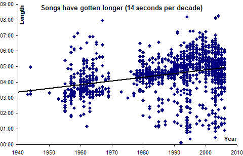 Since I like Tamil songs and statistics so much, I did some analysis on the ~1,400 Tamil songs I'd listened to in 2006. The trends are around the length of a typical film song are interesting. For example: Songs have gotten longer over time. On average, a song in the 60s was 4 minutes. A song in the 2000s is 5 minutes. Each decade adds about 14 seconds to the length of a song. ...