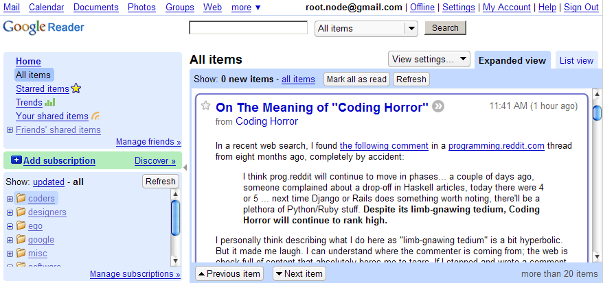 I’ve stopped visiting websites. No, really. There’s only one website I visit these days. Google Reader. Google Reader is a feed reader. If you want to just catch up on the new stuff on a site, you can add the site to Google Reader. Anything new that is published on the site appears in Google Reader. Right now, I’ve subscribed to over 50 feeds. There’s no way I can remember to visit 50 sites – so I’m actually able to read more and miss less. ...