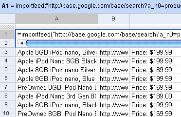 I’d written earlier about Web lookup in Excel. I showed an example how you could create a movie wishlist that showed the links to the torrents from Mininova. You can do that even easier on Google Spreadsheets. It has 4 functions that let you import external data: =importData(“URL of CSV or TSV file”). Imports a comma-separated or tab-separated file. =importFeed(URL).vLets you import any Atom or RSS feed. =importHtml(URL, “list” | “table”, index). Imports a table or list from any web page. =importXML(“URL”,“query”). Imports anything from any web page using XPath. Firstly, you can see straight off why it’s easy to view RSS feeds in Google Spreadsheets. Just use the importFeed function straight away. So, for example, if I wanted to track all 8GB iPods on Google Base, I can import its feed in Google Spreadsheets. ...