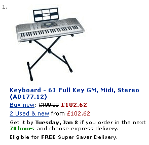 I’m thinking of buying a digital keyboard with touch sensitive keys and MIDI support. (The one other thing that I thought off – a pitch bend – puts the keyboards out of my budget.) I’d like a good deal. (Who doesn’t?) But I don’t like to spend time searching for one. (Who does?) So here’s the plan. Firstly, I’ll restrict my search to Amazon.co.uk. For electronics items, I haven’t found anyone consistently cheaper. Tesco has some pretty low prices, but not the range. eBuyer is pretty good, but not often enough. Google Products is the only other one that gets me consistent lower prices, but I’ve had my credit card identity stolen once before while shopping online, so I’d rather not pick any random seller listed on Google. ...