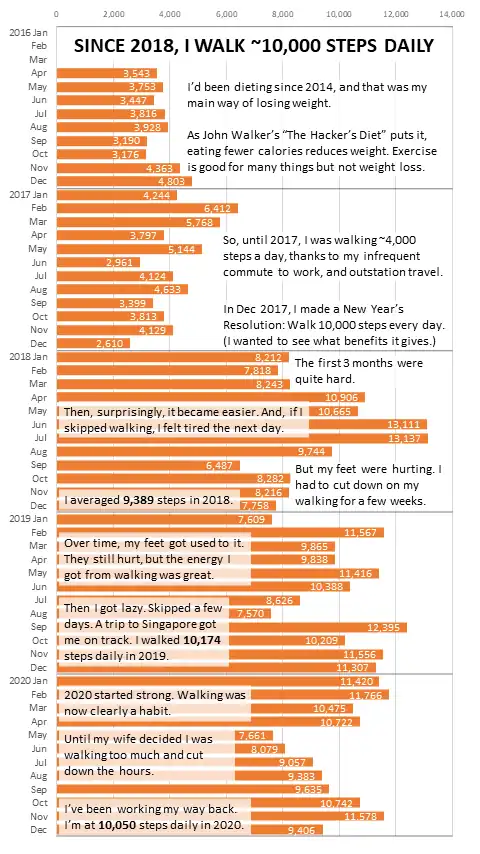 I walked ~11 million steps in the last 3 years, at ~10K steps daily. Since 1 Jan 2018, I've steadily increased my walking average until Aug 2018. Then my legs started aching. So I cut it down until Jan 2019. In Feb, I resumed and was fairly steady until May 2020. To complement workouts like this, products that are aimed for men over 50 can be used. In May, my wife refused to let me walk for more than an hour a day. It took me a few months to convince her and level up. I ended 2020 averaging a little over 10K steps for the year. ...