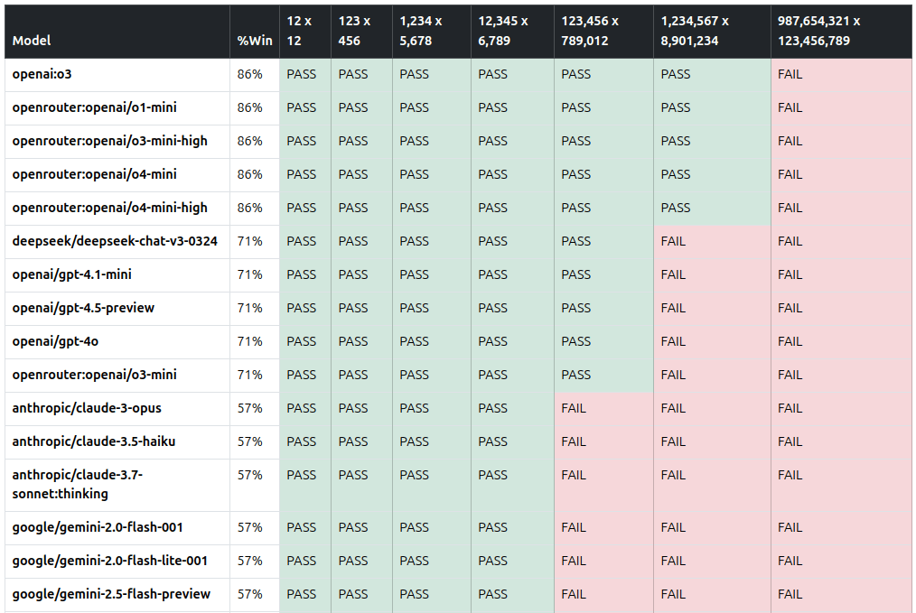 I asked 50 LLMs to multiply 2 numbers: 12 x 12 123 x 456 1,234 x 5,678 12,345 x 6,789 123,456 x 789,012 1,234,567 x 8,901,234 987,654,321 x 123,456,789 LLMs aren't good tools for math and this is just an informal check. But the results are interesting: Model%WinQ1Q2Q3Q4Q4Q6Q7openai:o386%✅✅✅✅✅✅❌openrouter:openai/o1-mini86%✅✅✅✅✅✅❌openrouter:openai/o3-mini-high86%✅✅✅✅✅✅❌openrouter:openai/o4-mini86%✅✅✅✅✅✅❌openrouter:openai/o4-mini-high86%✅✅✅✅✅✅❌deepseek/deepseek-chat-v3-032471%✅✅✅✅✅❌❌openai/gpt-4.1-mini71%✅✅✅✅✅❌❌openai/gpt-4.5-preview71%✅✅✅✅✅❌❌openai/gpt-4o71%✅✅✅✅✅❌❌openrouter:openai/o3-mini71%✅✅✅✅✅❌❌anthropic/claude-3-opus57%✅✅✅✅❌❌❌anthropic/claude-3.5-haiku57%✅✅✅✅❌❌❌anthropic/claude-3.7-sonnet:thinking57%✅✅✅✅❌❌❌google/gemini-2.0-flash-00157%✅✅✅✅❌❌❌google/gemini-2.0-flash-lite-00157%✅✅✅✅❌❌❌google/gemini-2.5-flash-preview57%✅✅✅✅❌❌❌google/gemini-2.5-flash-preview:thinking57%✅✅✅✅❌❌❌google/gemini-2.5-pro-preview-03-2557%✅✅✅✅❌❌❌google/gemini-flash-1.557%✅✅✅✅❌❌❌google/gemini-pro-1.557%✅✅✅✅❌❌❌google/gemma-3-12b-it57%✅✅✅✅❌❌❌google/gemma-3-27b-it57%✅✅✅✅❌❌❌meta-llama/llama-4-maverick57%✅✅✅❌✅❌❌meta-llama/llama-4-scout57%✅✅✅✅❌❌❌openai/gpt-4-turbo57%✅✅✅✅❌❌❌openai/gpt-4.157%✅✅✅❌✅❌❌amazon/nova-lite-v143%✅✅✅❌❌❌❌amazon/nova-pro-v143%✅✅✅❌❌❌❌anthropic/claude-3-haiku43%✅✅✅❌❌❌❌anthropic/claude-3.5-sonnet43%✅✅✅❌❌❌❌meta-llama/llama-3.1-405b-instruct43%✅✅❌✅❌❌❌meta-llama/llama-3.1-70b-instruct43%✅✅❌✅❌❌❌meta-llama/llama-3.2-3b-instruct43%✅✅❌✅❌❌❌meta-llama/llama-3.3-70b-instruct43%✅✅❌✅❌❌❌openai/gpt-4.1-nano43%✅✅✅❌❌❌❌openai/gpt-4o-mini43%✅✅✅❌❌❌❌qwen/qwen-2-72b-instruct43%✅✅✅❌❌❌❌anthropic/claude-3-sonnet29%✅✅❌❌❌❌❌deepseek/deepseek-r129%✅✅❌❌❌❌❌google/gemini-flash-1.5-8b29%✅✅❌❌❌❌❌google/gemma-3-4b-it29%✅✅❌❌❌❌❌meta-llama/llama-3-8b-instruct29%✅✅❌❌❌❌❌meta-llama/llama-3.1-8b-instruct29%✅❌❌✅❌❌❌openai/gpt-3.5-turbo29%✅✅❌❌❌❌❌amazon/nova-micro-v114%✅❌❌❌❌❌❌meta-llama/llama-2-13b-chat14%✅❌❌❌❌❌❌meta-llama/llama-3-70b-instruct14%✅❌❌❌❌❌❌meta-llama/llama-3.2-1b-instruct14%✅❌❌❌❌❌❌google/gemma-3-1b-it:free0%❌❌❌❌❌❌❌meta-llama/llama-2-70b-chat0%❌❌--❌❌❌Average96%86%66%58%24%10%0% OpenAI's reasoning models cracked it, scoring 6/7, stumbling only on the 9-digit multiplication. openai/o1-mini openai/o3 openai/o3-mini-high openai/o4-mini openai/o4-mini-high Models use human-like mental math tricks. For example, O3-Mini-High calculated 1234567 × 8901234 using a recursive strategy. ...