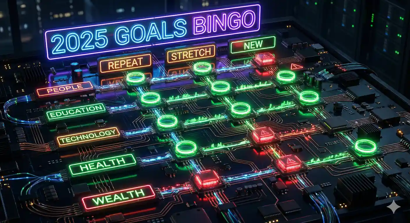 Here’s the report card for my 2025 goals bingo. Domain Repeat Stretch New People 🟢 Better husband 🔴 Meet all first cousins 🟢 Interview 10 experts 🔴 Live with a stranger Education 🟢 50 books 🟢 Teach 5,000 students 🟢 Run a course only with AI Technology 🟢 20 data stories 🔴 LLM Foundry: 5K MaU 🟢 300 days of GitHub 🔴 Build a robot 🟢 Co-present with an AI Health 🟢 300 days of yoga 🔴 80 heart points/day 🔴 Bike 1,000 km 🟢 Vipassana Wealth 🔴 Buy low 🔴 Beat inflation 5% 🟢 Donate $10K 🔴 Fund a startup The “Education” and “Technology” rows have a BINGO! Repeat goals were easier than new goals were easier than strech goals (no surprise). 11/20 wins means I’m picking realistic and ambitious goals. ...