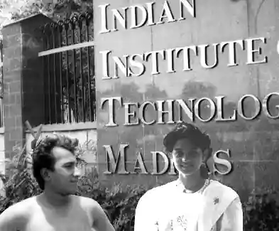 I was working for the campus magazines as publisher. That more or less gave me free access to considerable resources. I insisted that images needed to be scanned for the magazine, and managed to push in these two photos for scanning. Now I had all the resources I wanted. Pulling together all the image processing tools on the campus (Autodesk Animator and CorelDRAW! in particular) I set about removing the background from their images. Since I’d run out of time for the bet anyway, I had worked out a master plan by then. I put them both in front of the IIT gate, photographed the monitor and got what looked close enough to a real photo - though black & white.