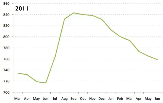 Students born in June 1991 scored the lowest – around 720/1200. This suddenly shoots up in July, then in August, and the students born in September score as much as 840/1200 on average. From there on, it’s downhill.