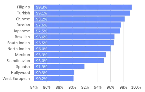 In comparison, the Chinese group has ~20,000 actors. They act with each other 98% of the time. When they do act outside the group, it’s mostly with Hollywood (0.5%), Japanese (0.3%), South Korean (0.3%), and Indonesian (0.1%)