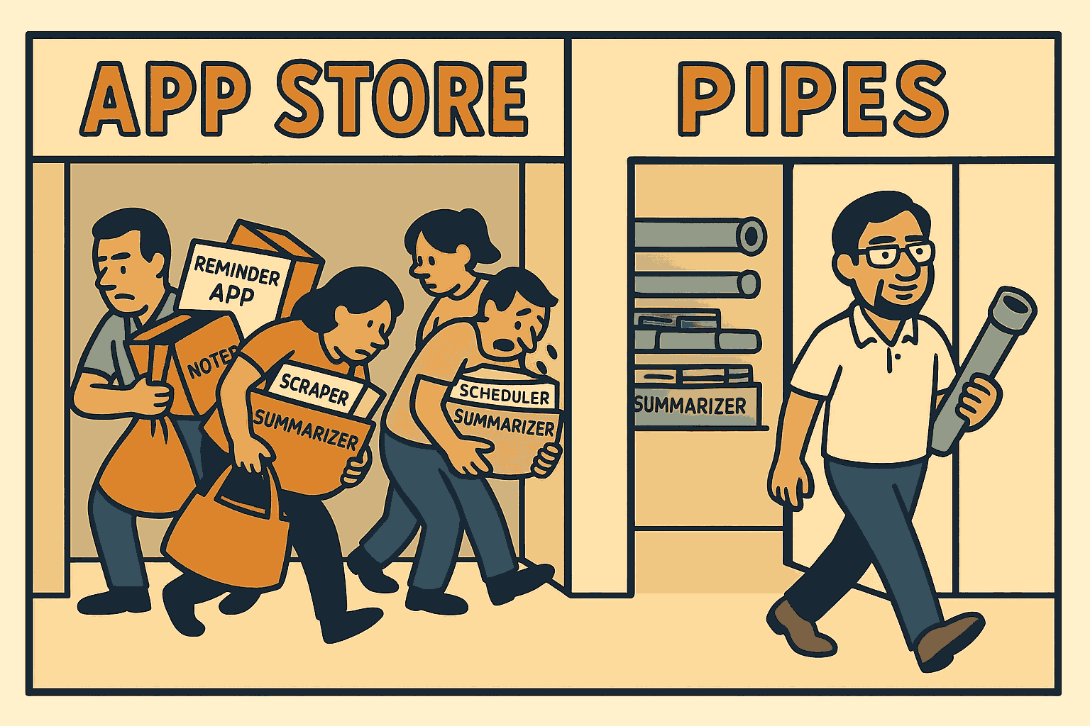 Switching to a Linux machine has advantages. My thinking’s moving from apps to pipes. I wanted a spaced repetition app to remind me quotes from my notes. I began by writing a prompt for Claude Code: Write a program that I can run like uv run recall.py --files 10 --lines 200 --model gpt-4.1-mini [PATHS...] that suggests points from my notes to recall. It should --files 10: Pick the 10 latest files from the PATHs (defaulting to ~/Dropbox/notes) --lines 200: Take the top 200 lines (which usually have the latest information) --model gpt-4.1-mini: Pass it to this model and ask it to summarize points to recall ...