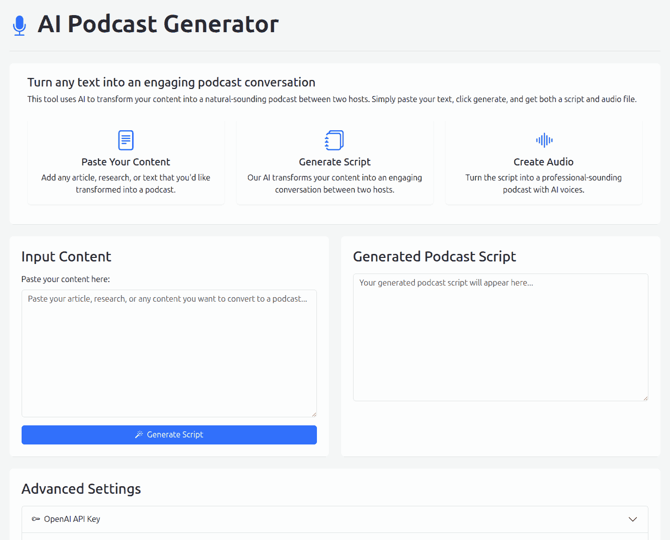 I built podcast generator app in one-shot. I wrote a prompt, fed it to an LLM, and it generated the output without errors. I tested three LLMs, and all produced correct, working output. ChatGPT: o4-mini-high Functional but missed my specs in three ways: No error if I skip the API key No progress indicator for audio generation Both voices default to “ash” (should be “ash” and “nova”) Gemini 2.5 Pro: Works and looks great! Claude 3.7 Sonnet: Works great and looks even better! It still took me an hour to craft the prompt – even after I’d built a Python prototype and my colleague built a similar web version. ...