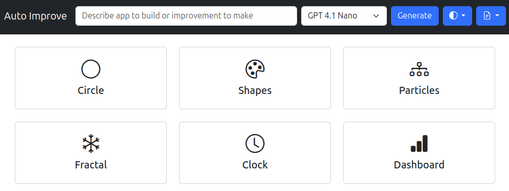 What if you keep ask an LLM Improve the code - dramatically!? We used the new GPT 4.1 Nano, a fast, cheap, and capable model, to write code for simple tasks like “Draw a circle”. The we fed the output back and asked again, Improve the code - dramatically! Here are the results. Draw a circle rose from a fixed circle to a full tool: drag it around, tweak its size and hue, and hit “Reset” to start fresh. Animate shapes and patterns turned simple circles and squares into a swarm of colored polygons that spin, pulse, and link up by distance. Draw a fully functional analog clock grew from a bare face to one that builds all 60 tick marks in code—no manual copy‑paste needed. Create an interactive particle simulation went from plain white dots on black to hundreds of bright, color‑shifting balls that bounce, die, and come back to life. Generate a fractal changed from a single Mandelbrot image to an explorer you can zoom, drag, and reset with sliders and the mouse wheel. Generate a dashboard jumped from static charts to a live page with smooth card animations, modern fonts, and a real‑time stats box. A few observations. ...