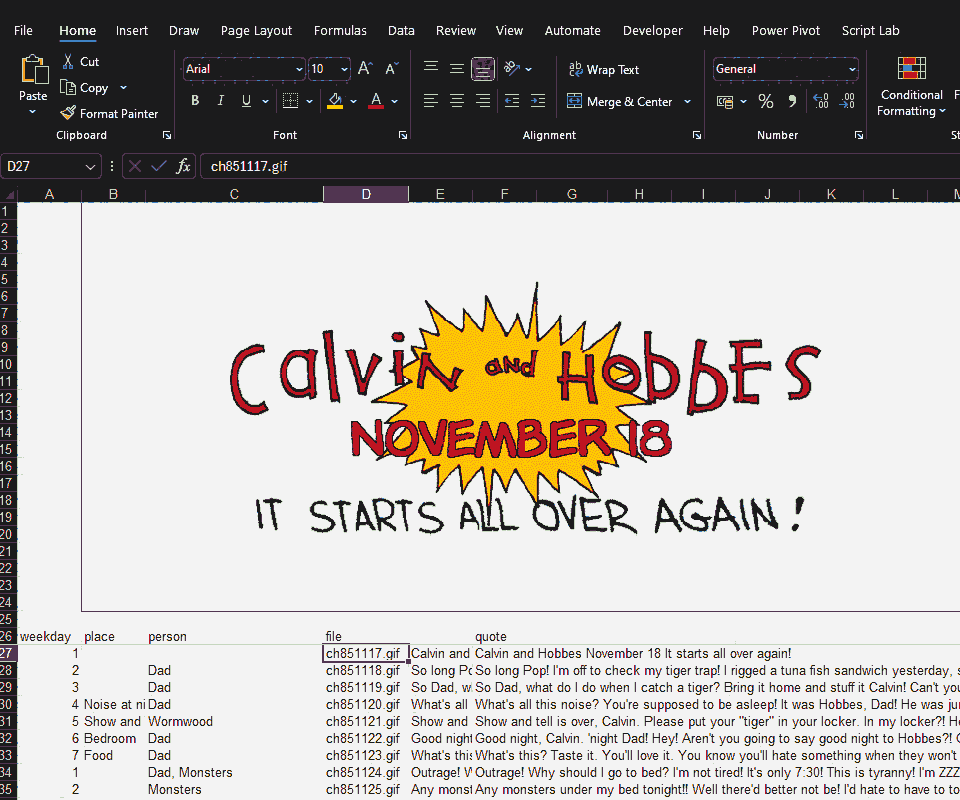 In Excel, using Visual Basic, you can change an image as you scroll. This makes it easy to look at each image and annotate it. This is how I transcribed every Calvin & Hobbes. I used this technique first when typing out the strips during my train rides from Bandra to Churchgate. I had an opportunity to re-apply it recently when we needed to tag hundreds of photographs based on a set of criteria. ...
