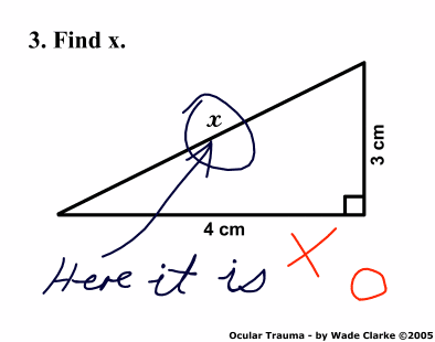 Comments D 9 May 2006 11:45 am: Is x = 5 or am I being naive? S Anand 9 May 2006 4:25 pm: It’s just a funny “cartoon” I saw. The black scrawl is what a student wrote in respone to “Find x” Arun 10 May 2006 4:33 am: :-) lol! that is funny. D 10 May 2006 7:16 am: Thank God! Good one :) dc 22 Sep 2006 3:19 am: ha!!! is the red XO an Elliot Smith reference? who else actually solved for x? S Anand 22 Sep 2006 6:17 am: Uh, who’s Elliot Smith? Nattharat Suaysompol 27 Oct 2008 10:08 pm: MATH HUMOR!! vadivelan 14 Feb 2009 4:21 am: hi, i lough about 30 mts after seeing this. very funny. mr x 25 Sep 2010 5:18 pm: yeah thats wat i did in my maths exam…..haha.. Anamika 1 Mar 2012 5:31 pm: Elliott Smith is an American singer & songwriter. ‘XO’ refers to one of his lyrics (XO, Mom It’s ok, it’s all right, nothing’s wrong) from the song Waltz #2 Here you go & get the meaning of it: http://www.songmeanings.net/songs/view/17346