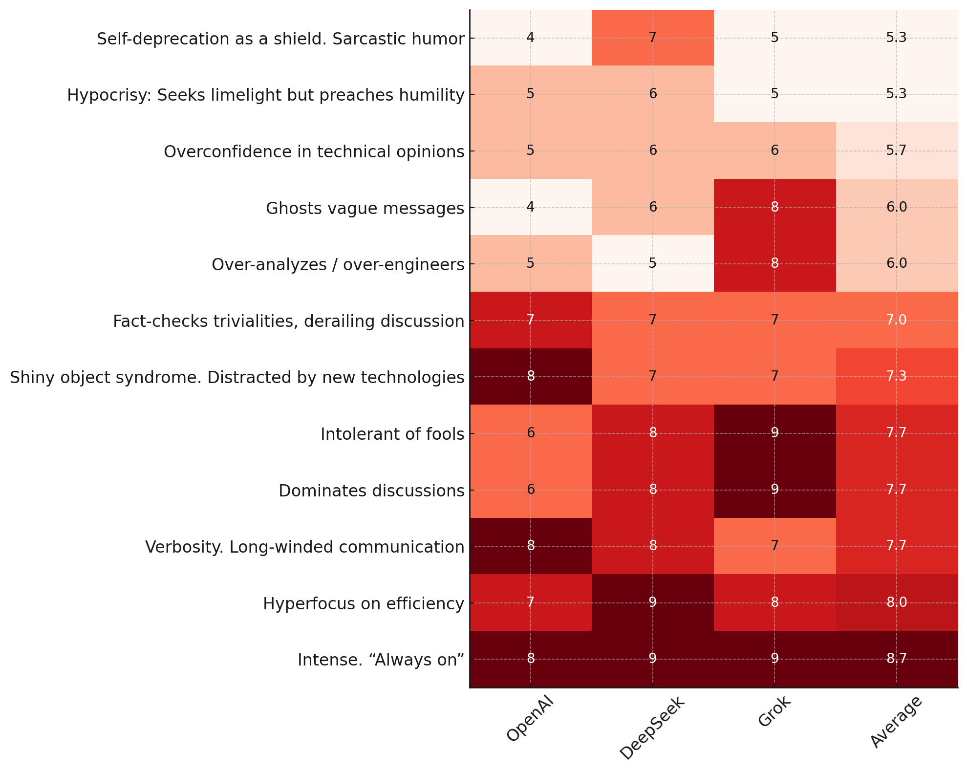 After ChatGPT's discussion of my personality flaws, I asked it to listing specific conversations as evidence for flaws. Then I asked 3 LLMs to rate the evidence. Personality FlawChatGPTDeepSeekGrokAverageSelf-deprecation as a shield. Sarcastic humor4755.3Hypocrisy: Seeks limelight but preaches humility5655.3Overconfidence in technical opinions5665.7Ghosts vague messages4686.0Over-analyzes / over-engineers5586.0Fact-checks trivialities, derailing discussion7777.0Shiny object syndrome. Distracted by new technologies8777.3Intolerant of fools6897.7Dominates discussions6897.7Verbosity. Long-winded communication8877.7Hyperfocus on efficiency7988.0Intense. “Always on”8998.7 🟢 LOW: Self-deprecation / sarcastic humour as shield ChatGPT: 4/10. Bio and a few quips reveal dry self-mockery, yet direct chat evidence of humour as defence is sparse; it surfaces only occasionally. | DeepSeek: 7/10. Explicit self-awareness goals and dry humor noted, but little evidence of defensive/sarcastic use. Grok: 5/10. Some self-deprecating humor exists, but its use as a shield is not strongly supported. 🟢 LOW: Hypocrisy: seeks limelight yet preaches humility ChatGPT: 6/10. You aspire to humility but routinely headline conferences and TEDx talks; the coexistence of public speaking and stated modesty gives the charge a middling footing. | DeepSeek: 6/10. TEDx/PyCon prominence contrasts with stated humility goals, though self-improvement efforts are genuine. Grok: 5/10. Public speaking contrasts with humility goals, though this may indicate self-awareness, not hypocrisy. 🟢 LOW: Over-confidence in technical opinions ChatGPT: 7/10. You assert strong views (e.g., Node vs FastAPI) but also invite verification and accept corrections, yielding only moderate evidence of over-confidence. | DeepSeek: 6/10. States strong preferences upfront but routinely invites validation and course-corrects. Grok: 6/10. Strong opinions are expressed, but openness to correction moderates the perception of overconfidence. 🟢 LOW: Ghosts vague messages ChatGPT: 5/10. You’ve stated you ignore low-context e-mails, but chat logs show you usually follow-up or clarify rather than disappear. | DeepSeek: 6/10. Documented tendency to ignore low-context questions, though chat logs show active clarification habits. Grok: 8/10. Multiple instances show the user ignoring or not responding to unclear or low-context messages. 🟢 LOW: Over-analyzes / over-engineers ChatGPT: 5/10. Designing auto-re-flow SVG chevrons and exhaustive RAG specs hint at depth beyond the simple solution, yet you also champion “smallest libraries” and lightweight rate-limiters. | DeepSeek: 5/10. Some prototype/structuring tendencies, but strong preference for minimal solutions counterbalances this. Grok: 8/10. The user often dives deeply into tasks, sometimes creating complex solutions for simple problems. 🟡 MEDIUM: Fact-checks trivialities, derailing discussion ChatGPT: 8/10. Many requests revolve around “double-check,” “fact-check,” or recalculating tiny details, which lengthens threads even when stakes are small. | DeepSeek: 7/10. Frequent accuracy demands and citation hunts elongate discussions, but stays focused when content is solid. Grok: 7/10. Evidence of prioritizing precision, like fact-checking minor details, can disrupt conversation flow. 🟡 MEDIUM: Shiny-object syndrome ChatGPT: 6/10. Parallel explorations of Godot, Matrix, Cloudflare Workers, SVG SmartArt, esp32-eye, etc. reveal a persistent pull toward new tech before finishing earlier threads. | DeepSeek: 7/10. Broad simultaneous explorations (Godot/WASM/DuckDB), though sustains core projects long-term. Grok: 7/10. Exploration of new technologies is frequent, but focus on core projects suggests a balanced curiosity. 🟡 MEDIUM: Intolerant of fools / low clarity ChatGPT: 7/10. Frequent demands for precise formats, citations, and “be specific” instructions show a low tolerance for ambiguity, though you still help patiently on non-technical questions. | DeepSeek: 8/10. Strong pattern of rejecting ambiguity/fluff, though softened by humor and non-technical engagements. Grok: 9/10. The user consistently demands clarity and efficiency, showing little patience for ambiguity or fluff. 🟡 MEDIUM: Dominates discussions ChatGPT: 4/10. Long, multi-part prompts and the need for TL;DRs suggest you can overshadow lighter voices, but you periodically insist on brevity and delegate tasks, tempering the effect. | DeepSeek: 8/10. Long technical messages (avg ~3k chars) and intense Q&A patterns create conversational dominance. Grok: 9/10. Detailed, technical responses consistently steer and dominate conversations. 🟡 MEDIUM: Verbosity / long-winded communication ChatGPT: 5/10. Average messages run several thousand characters, and you often request exhaustive, multi-section outputs—though you sometimes tell the assistant “Shorter please,” verbosity remains a clear pattern. | DeepSeek: 8/10. Multi-step technical requests dominate interactions, though periodic "shorter please" self-corrections exist. Grok: 7/10. Messages are often lengthy and detailed, though the user also requests concise responses from others. 🔴 HIGH: Hyper-focus on efficiency ChatGPT: 8/10. Recurrent themes—cost monitoring, smallest-lib preference, GPU-utilization alerts—show you relentlessly optimise workflows and expect others to keep pace. | DeepSeek: 9/10. Unambiguous prioritization of concise formats, minimal libraries, and metric-driven optimization. Grok: 8/10. Repeated emphasis on concise, efficient communication and minimal tools is evident. 🔴 HIGH: Intense – “always on” ChatGPT: 8/10. Around-the-clock, multi-topic requests (weekend cron jobs, 2 a.m. prototypes) portray sustained high energy, with only a few calmer “travel nerves” moments as counter-weight. | DeepSeek: 9/10. High-volume technical queries across domains, 6am research routines, and rapid prototyping habits. Grok: 9/10. High energ