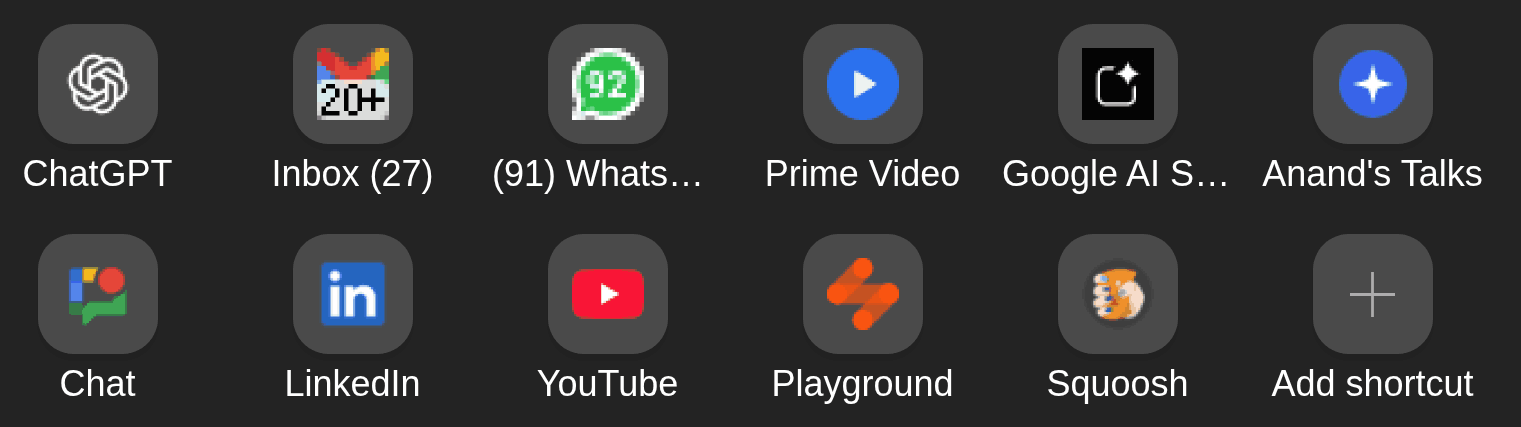 Here are the 10 most frequent sites I use (based on Microsoft Edge’s home bar): ChatGPT. It replaced Google as my default knowledge source. I prefer it over Gemini, Claude, etc. because the app has good features (memory from past conversations, code interpreter, strong voice mode, remote MCP on web app, etc.) The OpenAI models have pros and cons, but the app features are ahead of competition. Gmail. It’s my work inbox. Interestingly, I check it more (and respond faster) than social channels (e.g. WhatsApp, Google Chat, LinkedIn). It also doubles up as my task queue. Prime Video. I mainly watch The Mentalist. Totally love Patrick Jane! Google AI Studio. Mostly for transcription. It’s better than Gemini on UI, ability to handle uploads, file-formats, etc. It’s also free (though the data is used for training.) My Talks page. I give 1-1.5 talks a week, mostly on AI/ML topics. I use Marp to render Markdown slides and publish it here. Google Chat. It’s Straive’s social channel. I can’t use it from my phone, so I log in only if I need to check if I missed something. LinkedIn. It’s where I post by default. I don’t use it for networking and only connect with people I’ve met and know well. YouTube. Mostly for movie clips over dinner. I occasionally watch educational content. Playground. LLM Foundry is Straive’s internal gateway to multiple model APIs (I built it). I use it to experiment with models, grab API keys, and demo LLMs to clients. Squoosh. I compress every image, every time. Mostly into WebP (hands-down the best format today), typically lossless with an 8-color palette, or lossy at ~0-10% quality for photos. That’s my current home row. It will change. But the reasons probably won’t: fast, simple, automatable, and practical (for me).