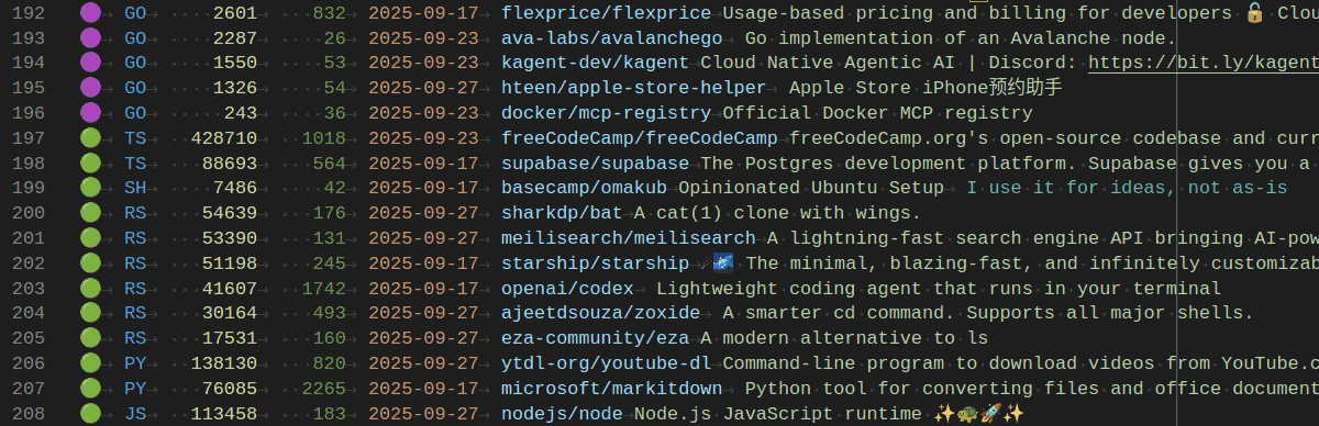 Here’s how I track trending GitHub repos each week. I run a scheduled script that saves a clean TSV I can scan fast. It uses uvx gtrending to fetch weekly trending repos for: Rust: High-quality system tools. (Anything in Rust seems cool.) Go: Reliable CLI/infra tools. (Like Rust, most Go code seems good.) Python: Most AI/ML stuff TypeScript: Most modern JS codebases JavaScript: Most front-end utilities Shell: Productivity scripts I pipe results through jq to extract: ...