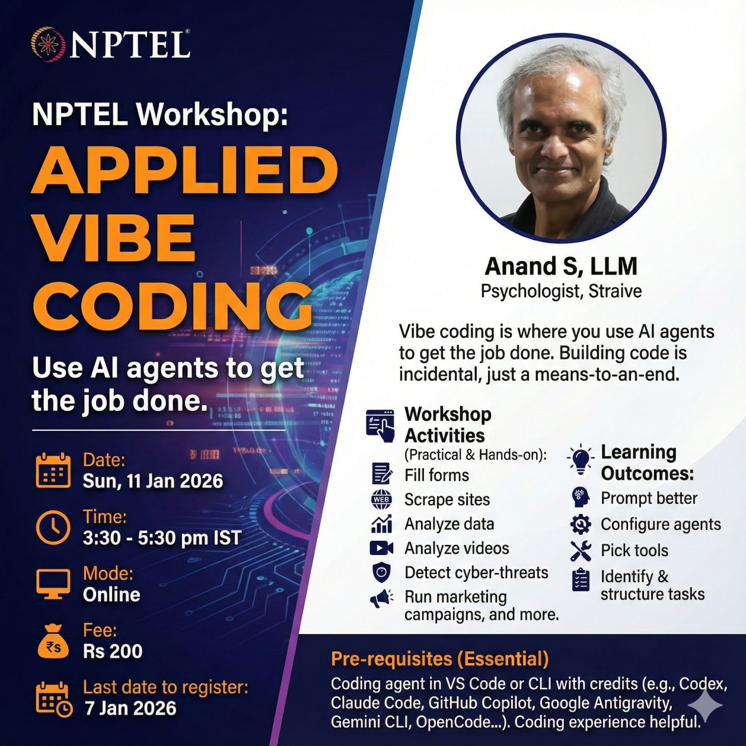 ChatGPT. It’s replaced Google as my default knowledge source. I prefer it over Gemini, Claude, etc. because the app has good features (memory from past conversations, code interpreter, strong voice mode, remote MCP on web app, etc.) The OpenAI models have pros and cons, but the app features are ahead of competition. Gmail. It’s my work inbox. Interestingly, I check it more (and respond faster) than social channels (e.g. WhatsApp, Google Chat, LinkedIn). It also doubles up as my task queue. WhatsApp. It’s my default phone + messaging app. A fair bit of my work communication happens here, too. Prime Video. I mainly watch The Mentalist. Totally love Patrick Jane! Google AI Studio. Mostly for transcription. It’s better than Gemini on UI, ability to handle uploads, file-formats, etc. It’s also free (though the data is used for training.) My Talks page: https://sanand0.github.io/talks/. I give 1-1.5 talks a week, mostly on AI/ML topics. I use Marp to render Markdown slides and publish it here. Google Chat. It’s Straive’s social channel. I can’t use it from my phone, so I log in only if I need to check if I missed something. LinkedIn. It’s where I post by default. I don’t use it for networking and only connect with people I’ve met and know well. YouTube. Mostly for movie clips over dinner. I occasionally watch educational content. LLM Foundry: https://llmfoundry.straive.com/. LLM Foundry is Straive’s internal gateway to multiple model APIs (I built it). I use it to experiment with models, grab API keys, and demo LLMs to clients. Squoosh. I compress every image, every time. Mostly into WebP (hands-down the best format today), typically lossless with an 8-color palette, or lossy at ~0-10% quality for photos. The list will change. But the reasons probably won’t: fast, simple, automatable, and practical (for me).