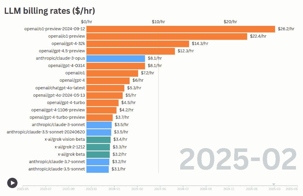 How much does an LLM charge per hour for its services? If we multiple the Cost Per Output Token with Tokens Per Second, we can get the cost for what an LLM produces in Dollars Per Hour. (We’re ignoring the input cost, but it’s not the main driver of time.) Over time, different models have been released at different billing rates. New powerful models like O3 cost ~$7/hr – Poland’s minimum wage rate. Gemini 2.5 Pro costs ~$12/hr – France’s minimum wage rate. The latest Claude 4 Sonnet costs ~$2/hr – India’s minimum wage rate. ...