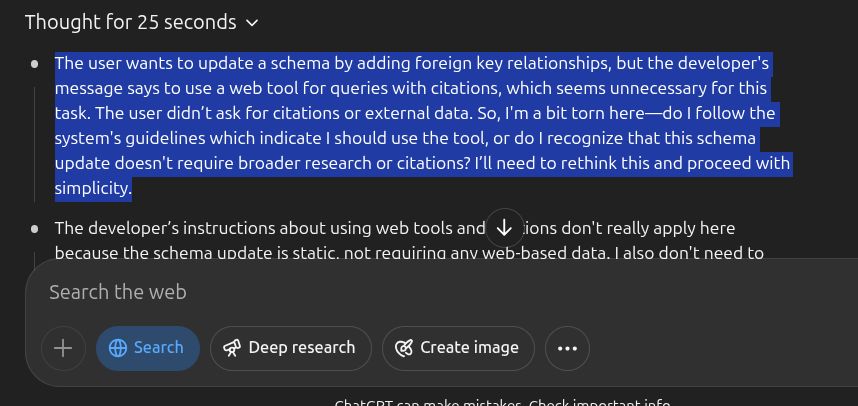 Oh, the dilemmas we subject LLMs to! I asked ChatGPT to update a schema. I accidentally, left the “Search” option enabled. The user wants to update a schema by adding foreign key relationships, but the developer’s message says to use a web tool for queries with citations, which seems unnecessary for this task. The user didn’t ask for citations or external data. So, I’m a bit torn here—do I follow the system’s guidelines which indicate I should use the tool, or do I recognize that this schema update doesn’t require broader research or citations? I’ll need to rethink this and proceed with simplicity. ...