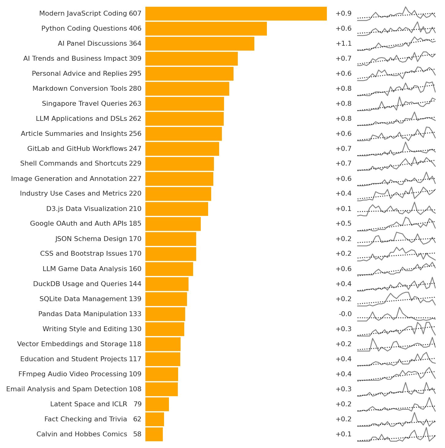 Here’s how I use ChatGPT, based on the ~6,000 conversations I’ve had in 2 years. My top use, by far, is for technology. “Modern JavaScript Coding” and “Python Coding Questions” are ~30% of my queries. There’s a long list with Markdown, GitLab, GitHub, Shell, D3, Auth, JSON, CSS, DuckDB, SQLite, Pandas, FFMPeg, etc. featured prominently. Next is to brainstorm AI use: “AI Panel Discussions”, “AI Trends and Business Impact”, “LLM Applications and DSLs”, “Industry Use Cases and Metrics” are also fast growing categories. I brainstorm talk outlines, refine slide deck narratives, and plan business ideas. ...