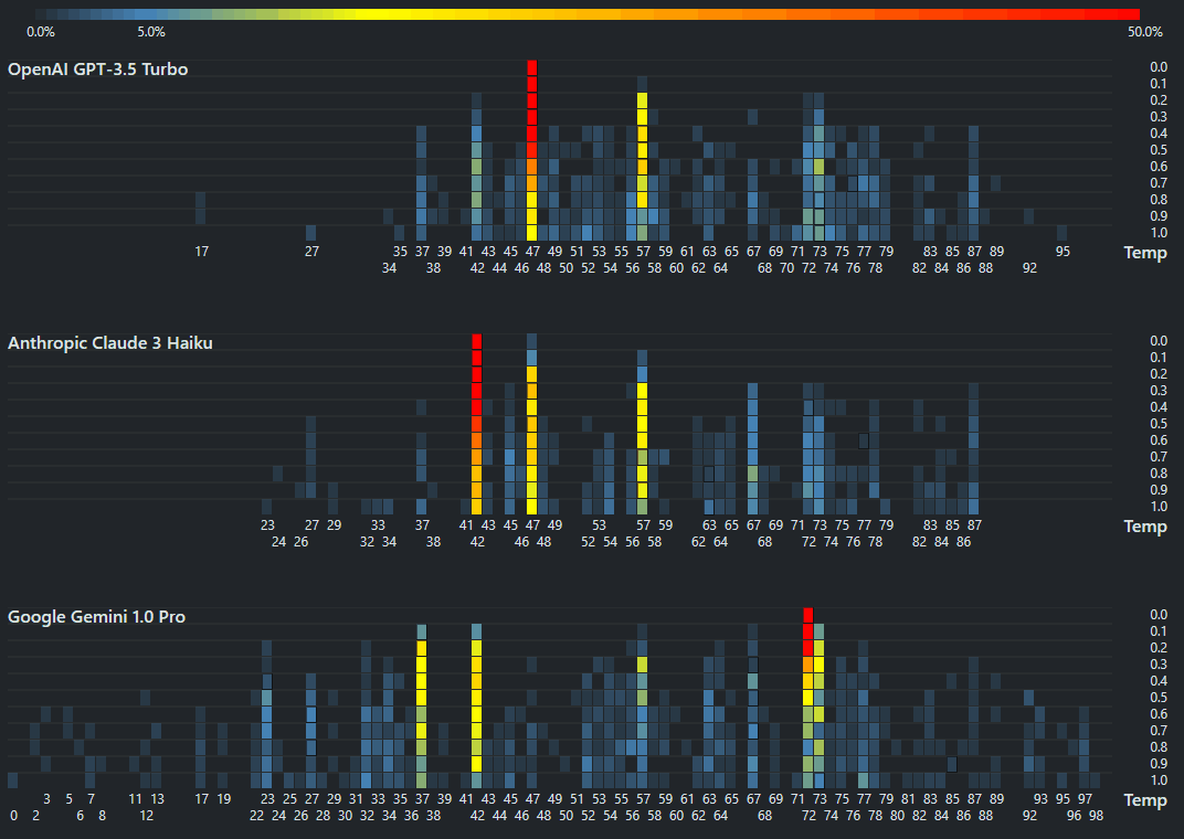When picking a number between 1-100, do #LLMs pick randomly? Or pick like a human? Leniolabs_ found #ChatGPT prefers 42. Gramener re-ran the experiment. Things have changed a bit. Now, 47 is the new favorite. But Claude 3 Haiku latched on to 42 as its favorite. Gemini’s favorite is 72. See https://sanand0.github.io/llmrandom/ They all avoid multiples of 10 (10, 20, …), repeated digits (11, 22, …), single digits (1, 2, …) and prefer 7-endings (27, 37, …). These are clearly human #biases – avoiding regular / round numbers and seeking 7 as “random”. ...