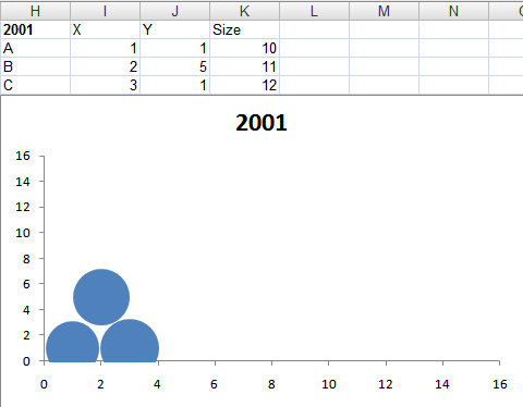 Creating motion charts in Excel is a simple four-step process. Get the data in a tabular format with the columns [date, item, x, y, size] Make a “today” cell, and create a lookup table for “today” Make a bubble chart with that lookup table Add a scroll bar and a play button linked to the “today” cell For the impatient, here’s a motion chart spreadsheet that you can tailor to your needs. For the patient and the puzzled, here’s a quick introduction to bubble and motion charts. ...