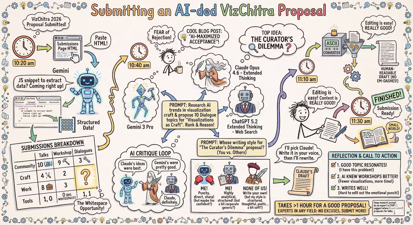 10:20 am. After submitting my VizChitra 2026 talk proposal, did a quick analysis of the submissions. Copy the HTML from the submissions page and paste into Gemini. Ask it: “Given this HTML, share a JS snippet I can copy and paste into DevTools that will return an array of objects containing all the useful information about each submission.” Paste the JS snippet into DevTools and get the structured result. Here’s the breakdown of submissions (excluding exchibitions): ...