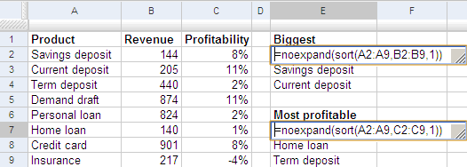 For example, if you have a list of products, their revenues and profits in A2:C9. Type SORT(A2:C9, 2, FALSE) in cell E2 to get the products sorted by the second column, revenues.