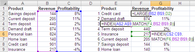 The MATCH function finds the revenue in the first table, and the INDEX function looks up the corresponding product. You can use the same principle to get the profitability. However, this will not work if two products have the same revenue figure.