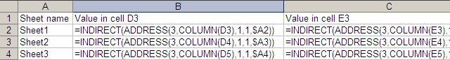 ADDRESS does the opposite. ADDRESS(ROW(D3),COLUMN(D3)) = ADDRESS(3,4) = “$D$3”. ADDRESS(3,4,1,1,“Sheet2”) returns “Sheet2!$D$3”. (See help for the ,1,1 in the middle, and just put it in always.) To cells D3:Z3 from all the sheets, copy the formula INDIRECT(ADDRESS(3,COLUMN(D3),1,1,$A2)) to the entire range. The INDIRECT, ADDRESS, ROW/COLUMN combination can slice contiguous data across sheets in any way you want.