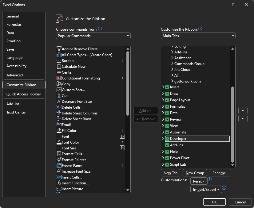 STEP 2: Open File > Options (Alt-F-T), go to Customize Ribbon. Under “Customize the Ribbon”, enable the “Developer” menu.