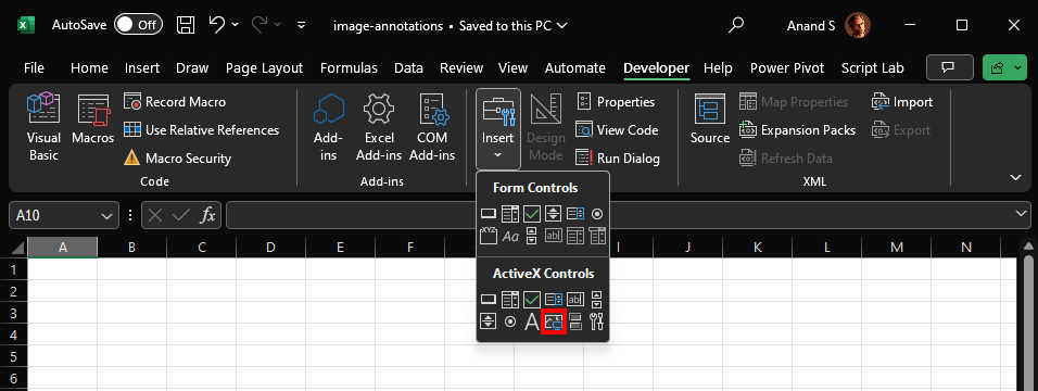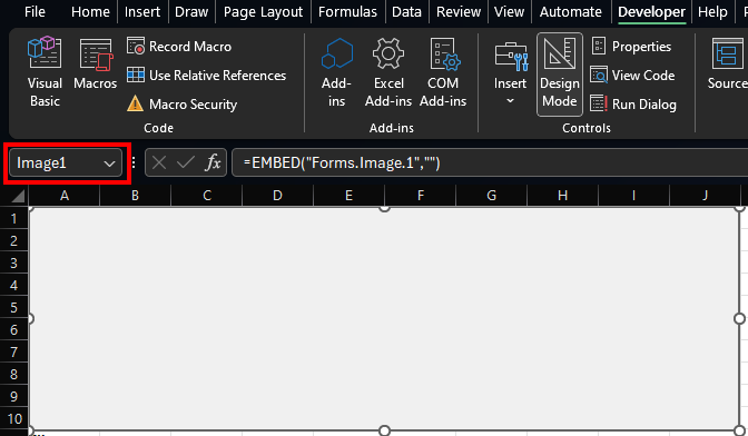 STEP 3: In Developer > Insert > ActiveX Controls, select Image and draw a rectangle from A1 to J10. (Resize it later.)