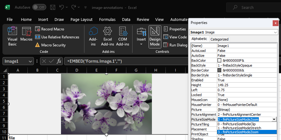 STEP 7: Select Developer > Design Mode. Click on Image1. Then select Developer > Properties. In this panel, under PictureSizeMode, choose 3 - fmPictureSizeModeZoom to fit the picture.