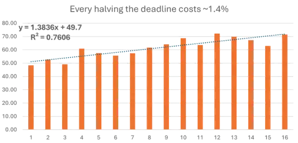 On average, every time the deadline is halved, the score drops by 1.4%.