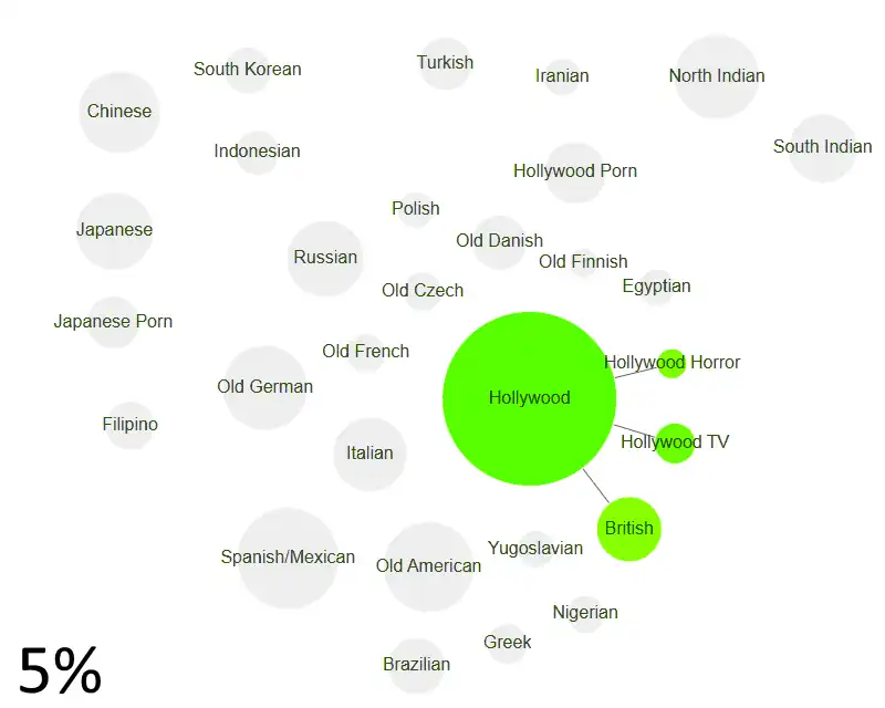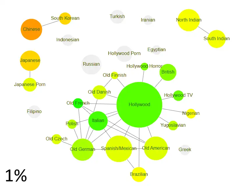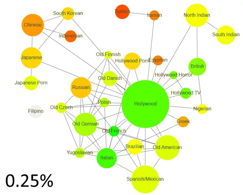 The Japanese and Japanese porn actors form a cluster too. (Interestingly, it’s easy for a Japanese porn actor to act with mainstream Japanese actors. Hollywood porn actors find it far harder to act with Hollywood.)