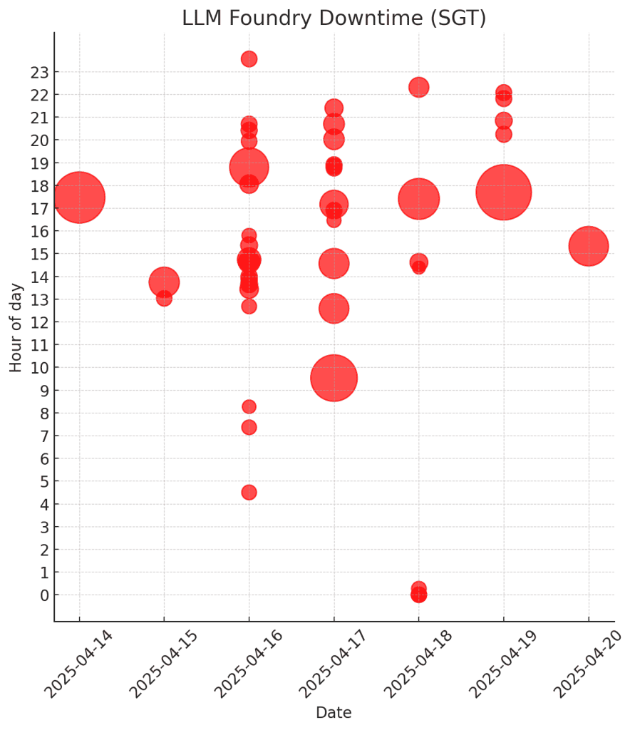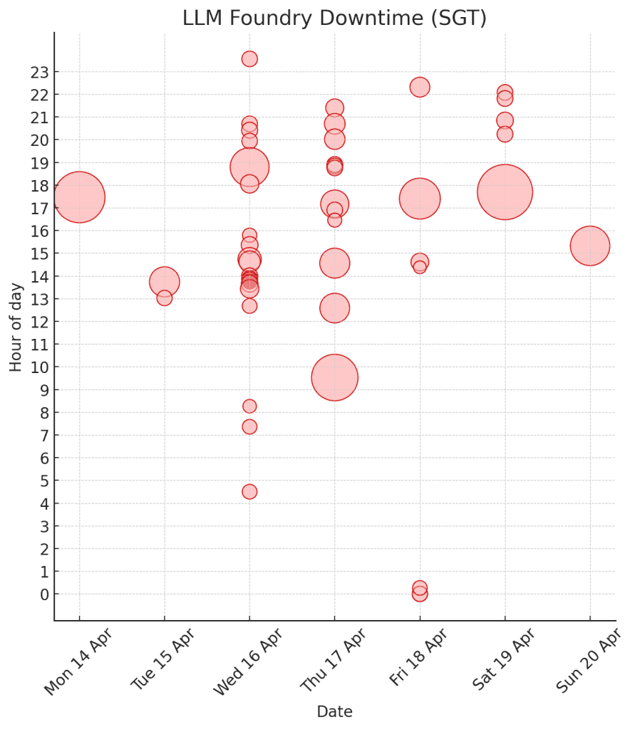 Make the circles red with the same level of transparency. Set the title to “LLM Foundry Downtime (SGT)”. Instead of jittering the circle, let the Y position be the middle of the outage time.