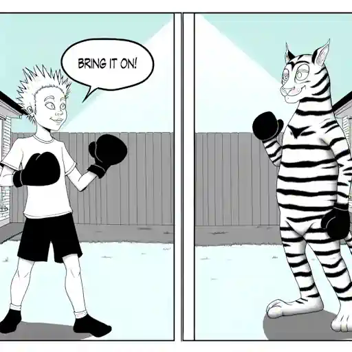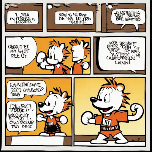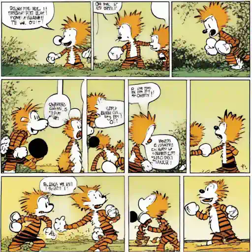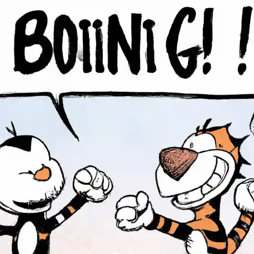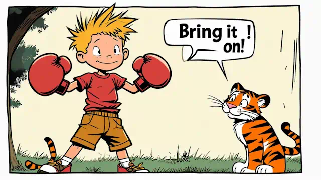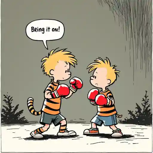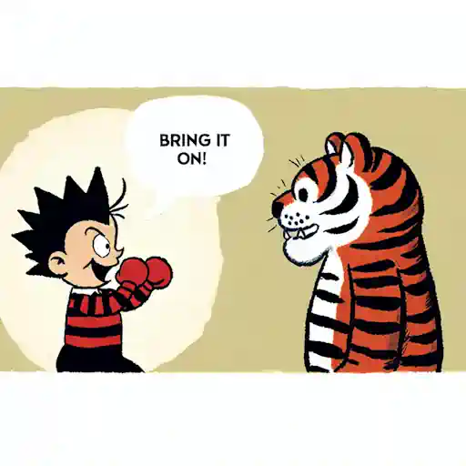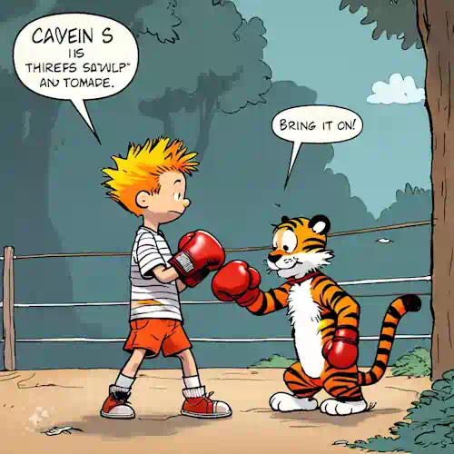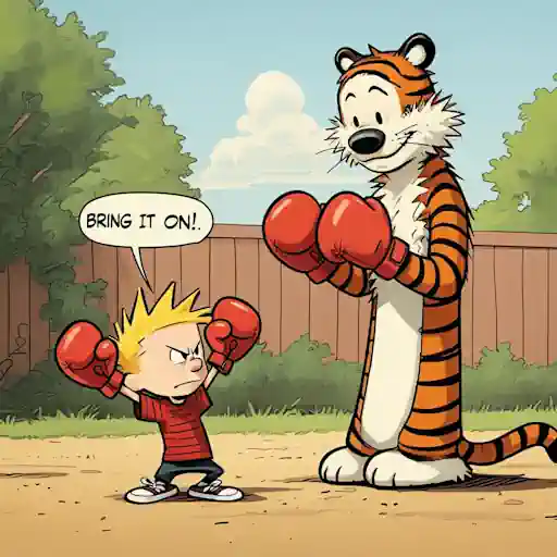 A comic strip style image featuring Calvin, a young boy with spiky hair, standing in a playful boxing stance with oversized boxing gloves. He looks determined as he says ‘Bring it on!’ in a speech bubble. Facing him is Hobbes, a tall and slightly bemused tiger, also in a mock boxing pose with a gentle smile, as if humoring Calvin. The scene is set in Calvin’s backyard, typical of a Calvin and Hobbes comic, with a simple and uncluttered backdrop.