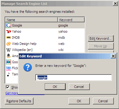 But the great thing is that this can be customised. On Firefox, click on the down arrow icon next to the search box and select “Manage Search Engines…” to see a list of your search engines. Select the one you want to use, click on “Edit Keyword…” and select the keyword you want. For instance, I’ve typed “google”.