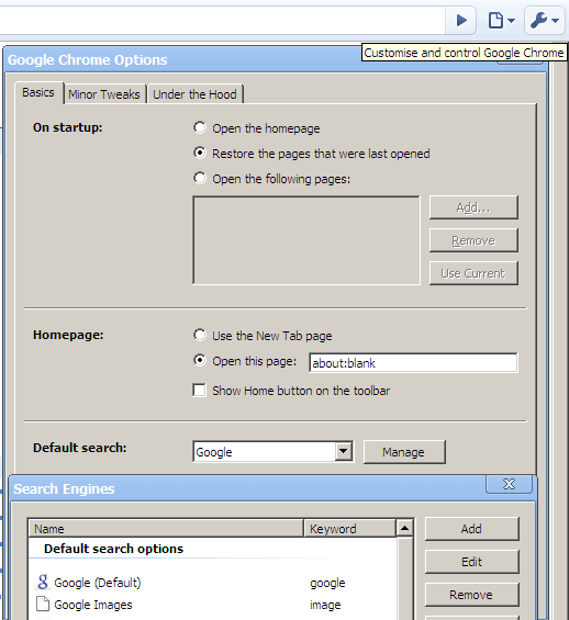 On Google Chrome, get to the Options (what, no shortcut key?) and in the Basics tab, click the Manage button. Here, you can click on “Add” to add a search engine.