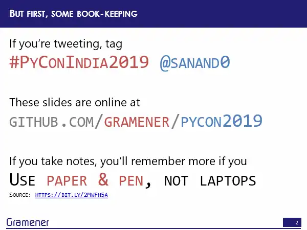 In case you’re tweeting, these are the hashtags, you probably want to be using the #PyconIndia, my hashtag my IDs, #SANAND0, you don’t need to worry about the slides, they are online. I’ve already posted on Twitter, the link to the slide deck, the slide deck that you’re using but if you desperately do want to take notes, then one small suggestion. Research has shown that taking notes on pen and paper is much better than taking notes on laptops if you want to remember stuff or on mobile phones. So this was a discovery for me. In fact, it was my discovery of the year and I’m following it diligently. Do give it a shot if you want to take notes. Let’s dive in.