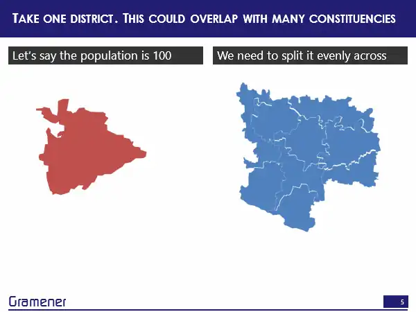 So, how do we solve this problem? Well, the logical way is you could take one district and a constituency or a set of constituencies, and let’s say the district has a population of 100, out of which we know that 13% are Muslims and we want to split it evenly across a bunch of constituencies.