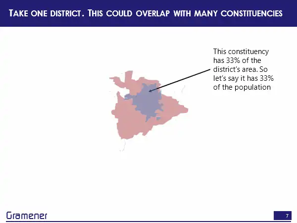 Or let’s take another constituency that overlaps with this district. So, now only a portion of this constituency overlaps with this district. So in this area, which takes up maybe about 1/5, or about 20% of that district population, I can say that population lives here. In other words, we are simply making an assumption that within a district, which is the lowest level of data that you have, or if you have village data that’s far more granular, the population is uniformly distributed. That’s the basic assumption.