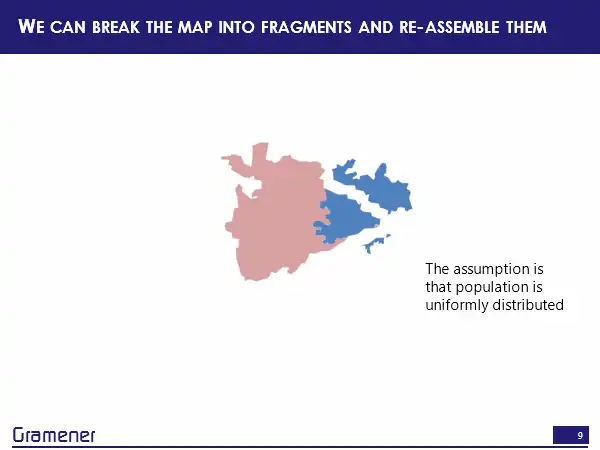 Now, what we can do is fragment each of these districts and constituencies by overlaying them and creating an intersection out of those, and reassembling those and this is a process that I call reshaping the map.