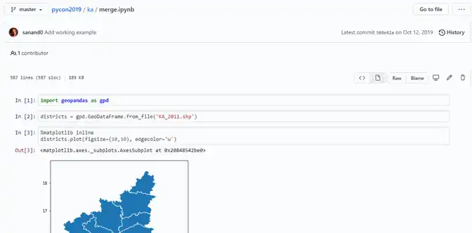 So let’s give it a shot. I’m going to open up the IPython notebook. The library that we are going to be using for this primarily, the core library is Geopandas. For those of you who have been working with data, Pandas is pretty much the de-facto library to use for any kind of data processing. Geopandas is becoming that kind of a standard for any shapefile. So if you have any shapefile and you want to do any kind of geospatial processing, an easy way of doing it is Geopandas and an easy way of installing it is through Conda using Anaconda. Rather than trying to do a pip install by yourself. It’s a little more efficient on most machines. So let’s import Geopandas. Now I have a shapefile that has the Karnataka census data which will eventually appear. I’m going to load it once it appears on the screen. (Just taking a long time. Okay, there we are back again.)