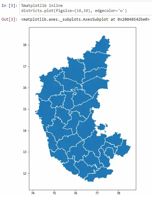 So GPD, which is the abbreviation for Geopandas, has a from_file function that lets you load any shapefile. Now, the other question you’ll have is where am I going to get these shapefiles from? We’ll come to that in a bit. It’s not as difficult as you might think. Let’s say you’ve downloaded the shapefiles. This particularly is the Karnataka census shapefile and what does this look like? Geopandas has a plotting function, which lets you see what the map looks like. So if you look at these districts, this is a pretty large district, this is Bangalore.