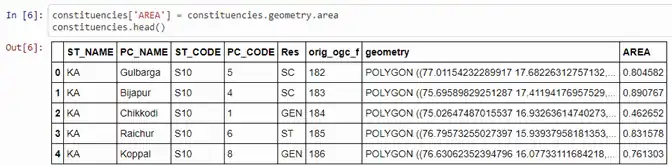 Let’s take the area for these. Geopandas offers an attribute called .geometry, which has an attribute called .area, which gets you the overall area of each of these regions, and if you want to look at what that data frame looks like, each of these regions corresponds to one row. So the Bagalkot district is one row, Bangalore rural district is one row and so on. All of the data in the shapefile also comes in here, you have a column called geometry, which has the additional geometry details, this is a pretty large column, which you probably won’t be going into the details of it. We’ve just now added one column called area, and this has the area of each of these regions and at the very least, you can figure out which are the larger regions, which are the smaller regions.