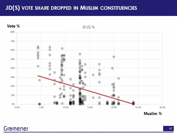 Turns out that where there were more Muslim populations, JD(S) actually got lower votes. So you can see the net result of this election and the alliance.