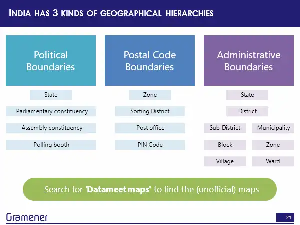 The third is the administrative boundary hierarchy. So there is a state there is a district, there’s also something called a division, but we’ll leave that aside, then there could be a sub district block or village, if it’s a rural area, or it could be municipality zone and ward if it’s a township.