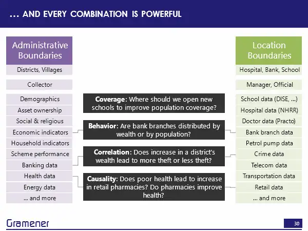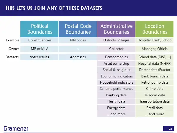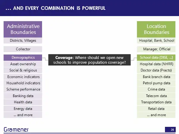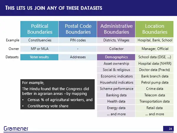 So effectively, anything that the government runs is reported by administrative boundaries. Anything that the corporate sector runs, by and large, is reported by locations. So between these two, there is enormous potential. But there’s also the fact of how decision making happens. Ultimately, political boundaries are owned, in some sense by an MP or an MLA. And, of course, there is also the associated IAS equivalents, who usually run it by administrative boundaries. So if I wanted somebody on the political side to make decisions, then I could take any of this data and put it on to the constituency boundaries. If I wanted an administrative official to make a decision, then I could take any of this data and put it on to a district. If I wanted a manager or a principal of a school, or the CEO of a hospital to make a decision, I could take all of that data and put it onto their geographic boundary.